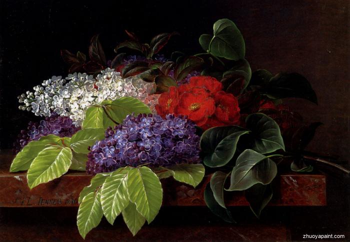 • TITLE: White and purple Lilacs, Camellia and Beech Leaves