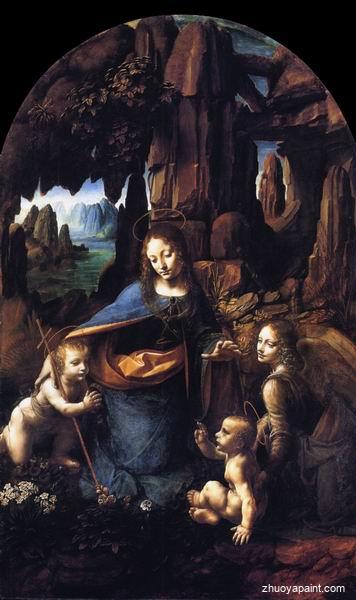 Virgin of the Rocks, originally hand painted by famous artist Leonardo da Vinci. This original masterpiece was painted on board in 1506. The original dimension is height: 189 cm (74.41 in.)and width: 120 cm (47.24 in.). It is currently located at National Gallery - London (England).