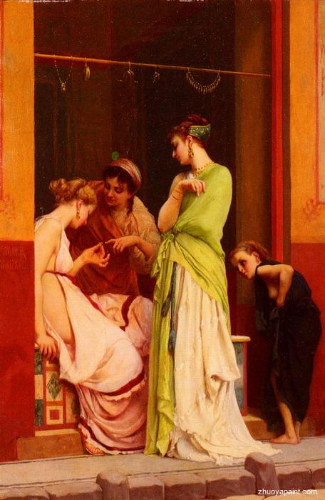 A Seller of Jewels in Pompeii was originally painted by Gustave Clarence Rodolphe Boulanger(1824-1888) who was a French figure painter. He was born at Paris, studied with Delaroche and Jollivet, and in 1849 took the Prix de Rome. His paintings are prime examples of academic art of the time, particularly history painting. They include a "Moorish Cafe"(1848), "Caesar at the Rubicon"(1865), the "Promenade in the Street of Tombs, Pompeii"(1869), and "The Slave Market"(1888). The recipient of many medals, he became a member of the Institut de France in 1882.