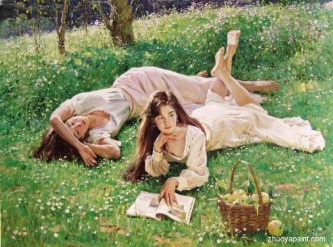 The two beautiful girls lying on the green grass, it is sure to bring a feeling of beauty and quiet. Why not grace your house with this reproduced masterpiece? It is sure to make your home become more beautiful and bring many admirers.
