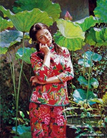 The young girl in red clothes with beautiful lotus leaves in the background give this painting an impressive look. It is sure to bring you a feeling of relaxation and beauty. Why not grace your house with this reproduced masterpiece?