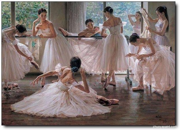 Ballet Dancers Practicing, a painting was originally hand painted by Chinese artist ZeJu Guan(1941-). He painted portraits, female body and ballet dancers oil paintings. He is a Senior Artist of the Guangzhou Art Institute and a member of the Artists´ Association of China. He currently resides in the United States where he works as a studio artist, and also a member of the American Society of Portrait Artists and has been awarded the distinction of Honorary Overseas Artist by the Guangdong Art Institute.