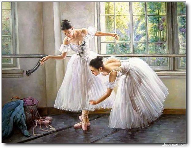 Two Ballet Dancers, a painting was originally hand painted by Chinese artist ZeJu Guan(1941-). He painted portraits, female body and ballet dancers oil paintings. The beautiful dance and body of Ballerina bring you a feeling of beauty, and show the elegant ballet art. It is suitable for hanging in living room, bedroom, hotel, great hall, showroom, exhibition hall, children room, cinema, saloon bar,theater, etc. Why not grace your house with this reproduced masterpiece? It is sure to make your home become more beautiful and bring many admirers.