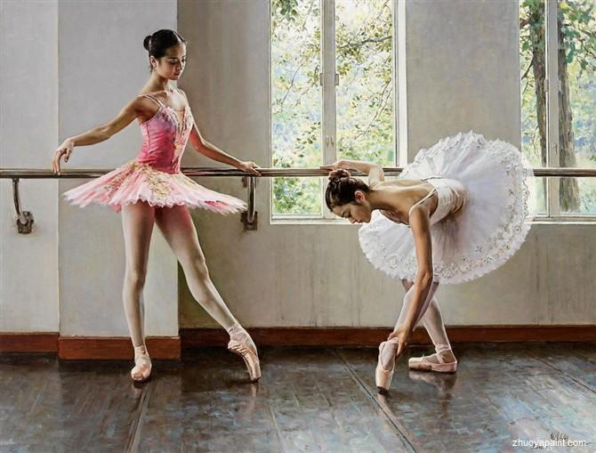 Two Dancers Exercising, a painting was originally hand painted by Chinese artist ZeJu Guan(1941-). He painted portraits, female body and ballet dancers. He is a Senior Artist of the Guangzhou Art Institute and a member of the Artists´ Association of China. He currently resides in the United States where he works as a studio artist, and also a member of the American Society of Portrait Artists and has been awarded the distinction of Honorary Overseas Artist by the Guangdong Art Institute.