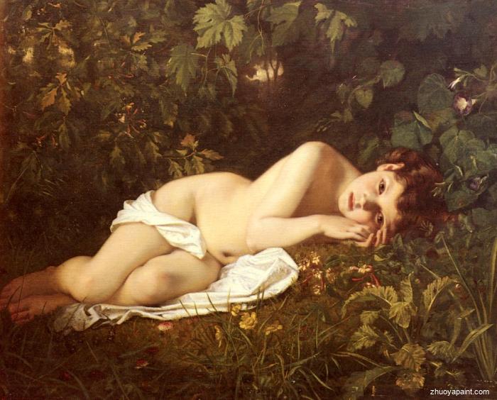Afternoon Dreaming, a painting was originally hand painted by Hugues Merle (1823–1881) who was a 19th Century French painter. He mostly depicted sentimental or moral subjects. He has often been compared with William-Adolphe Bouguereau.