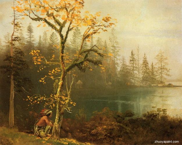Albert Bierstadt (1830-1902) was a German-American painter best known for his lush and large landscapes of the American West. In obtaining the subject matter for these works, Bierstadt joined several journeys of the Westward Expansion. Though not the first artist to record these sites, Bierstadt was the foremost painter of these scenes for the remainder of the 19th century. Bierstadt was part of the Hudson River School and its style involved carefully detailed paintings with romantic, almost glowing lighting, sometimes called luminism. An important interpreter of the western landscape, Bierstadt, along with Thomas Moran, is also grouped with the Rocky Mountain School.