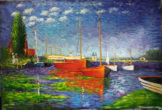 Red Boats at Argenteuil, originally hand painted by famous artist Claude Monet. This original masterpiece was painted on canvas in 1875. Claude Monet (1840 -1926), was a founder of French impressionist painting, and the most consistent and prolific practitioner of the movement´s philosophy of expressing one´s perceptions before nature, especially as applied to plein-air