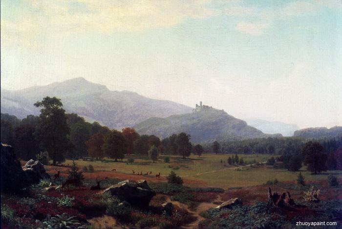 Albert Bierstadt (1830-1902) was a German-American painter best known for his lush and large landscapes of the American West. In obtaining the subject matter for these works, Bierstadt joined several journeys of the Westward Expansion. Though not the first artist to record these sites, Bierstadt was the foremost painter of these scenes for the remainder of the 19th century. Bierstadt was part of the Hudson River School and its style involved carefully detailed paintings with romantic, almost glowing lighting, sometimes called luminism. An important interpreter of the western landscape, Bierstadt, along with Thomas Moran, is also grouped with the Rocky Mountain School.