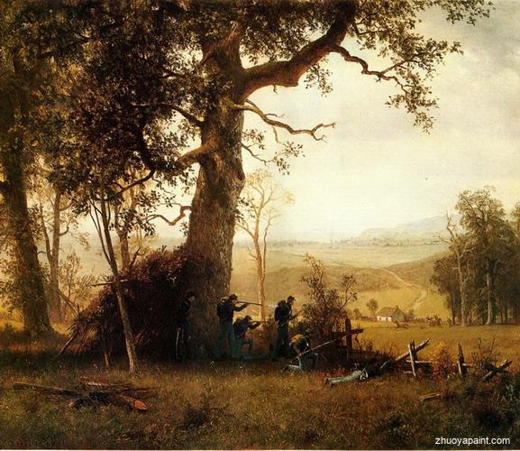 Guerilla Warfare (also known as Picket Duty in Virginia), originally hand-painted on canvas by artist Albert Bierstadt in 1862. This masterpiece has been reproduced by our professional artists carefully brushstroke by brushstroke, color by color to near perfection. Our artists not only reproduce every detail of this original oil painting, but also to capture its soul. Decorate your living room with this beautiful painting reproduction, it is sure to bring beauty to your room and attract gazes of wonder and admiration from your guests and visitors.