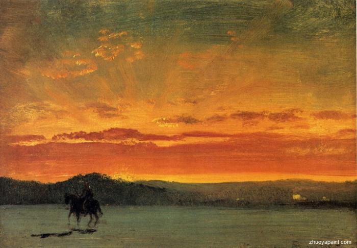 Indian Rider at Sunset, originally hand-painted on canvas by artist Albert Bierstadt. This masterpiece has been reproduced by our professional artists carefully brushstroke by brushstroke, color by color to near perfection. Our artists not only reproduce every detail of this original oil painting, but also to capture its soul. Decorate your living room with this beautiful painting reproduction, it is sure to bring beauty to your room and attract gazes of wonder and admiration from your guests and visitors.