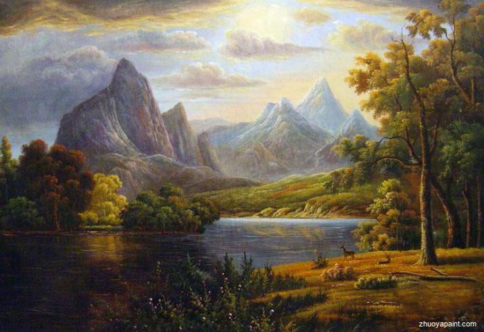 Landscape with Deer View of Estes Park Colorado, a painting was originally hand-painted by Albert Bierstadt in 1876. This masterpiece has been recreated carefully by our experienced artists. Our artists not only reproduce every detail of this original oil painting, but also to capture its soul. Why not grace your house with this beautiful painting, it is sure to add pleasantness and grandeur to your room and elevate your mood, making you feel relaxed and peaceful.