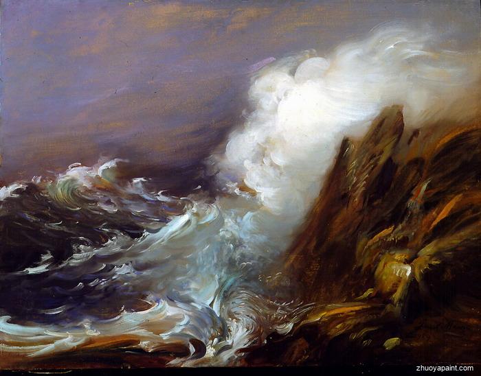 This is a remarkable oil painting with exceptional use of color, detail and brush strokes. Eagle Rock exhibits the allurement, charm and elegance of the oceanic presence. High-rise rocks, profound tides and illuminating sky are just a few of the many details this painting has to offer. A delightful setting that is sure to bring beauty to your house and many admirers. Why settle for a print or poster when you can catch many admirers with this museum quality oil painting reproduction? Or how about giving the art reproduction as a gift?