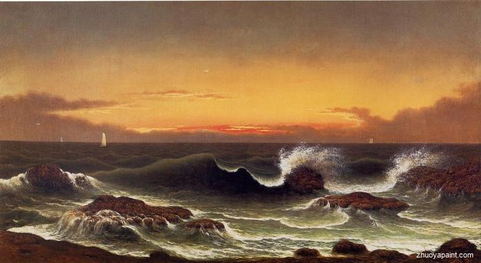 Seascape - Sunrise was originally painted by Martin Johnson Heade(1819-1904), he was a prolific American painter known for his salt marsh landscapes, seascapes, portraits of tropical birds, and still lifes. His painting style and subject matter, while derived from the romanticism of the time, is regarded by art historians as a significant departure from that of his peers.
