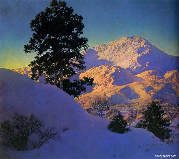 Winter Sunrise, a painting was originally hand painted by Maxfield Parrish (1870-1966), he was an American painter and illustrator active in the first half of the twentieth century. He is known for his distinctive saturated hues and idealized neo-classical imagery.