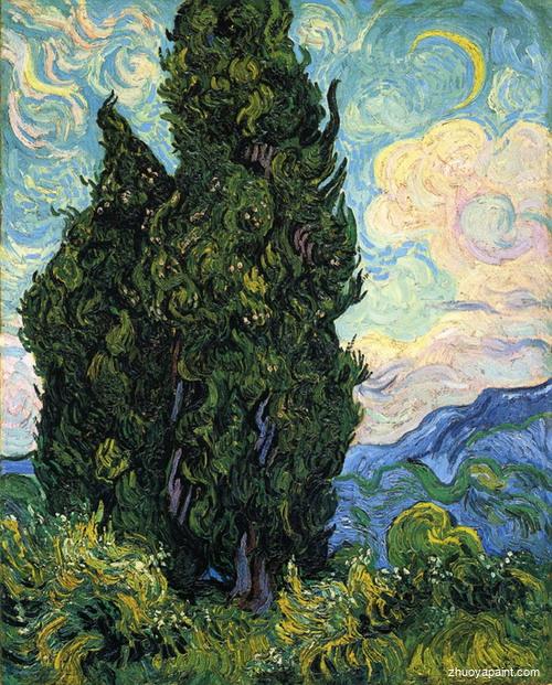 Cypresses, originally hand-painted by famous artist Vincent Van Gogh. This original masterpiece was painted on canvas in 1889. The original dimensions are height: 93.3 cm (36.73 in.)and width: 74 cm (29.13 in.). It is currently located at Metropolitan Museum of Art (United States).