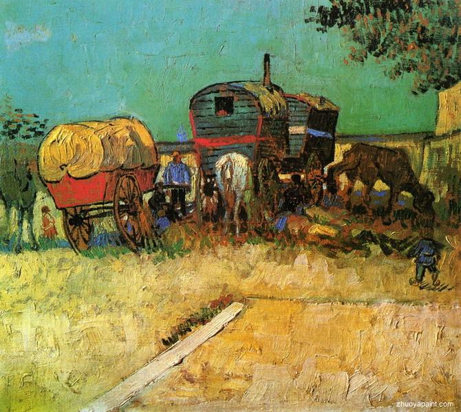 Encampment of Gypsies with Caravans, originally hand-painted by famous artist Vincent Van Gogh. This original masterpiece was painted on canvas in 1888. The original dimensions are height: 45 cm (17.72 in.)and width: 51 cm (20.08 in.). It is currently located at Musee d´Orsay (France).